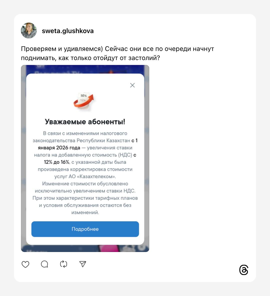 Пользователи в социальных сетях уже начали выражать обеспокоенность. В частности, в Threads обсуждаются уведомления, которые массово приходят пользователям. Абоненты опасаются, что вслед за «Казахтелекомом» стоимость услуг поднимут и другие мобильные операторы, такие как Beeline и Kcell, ссылаясь на аналогичные налоговые причины.