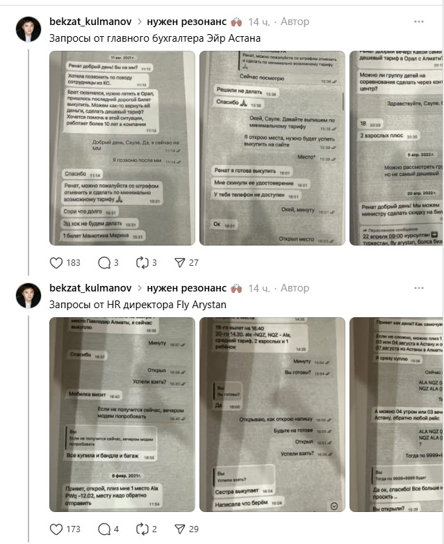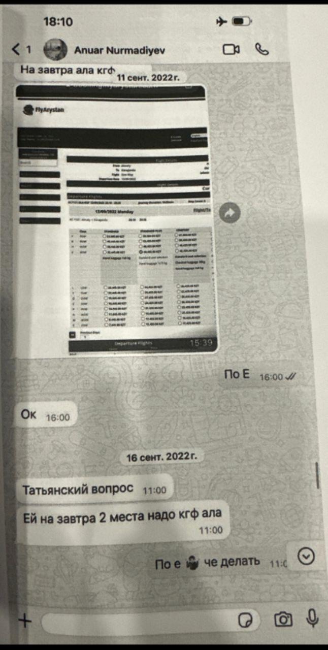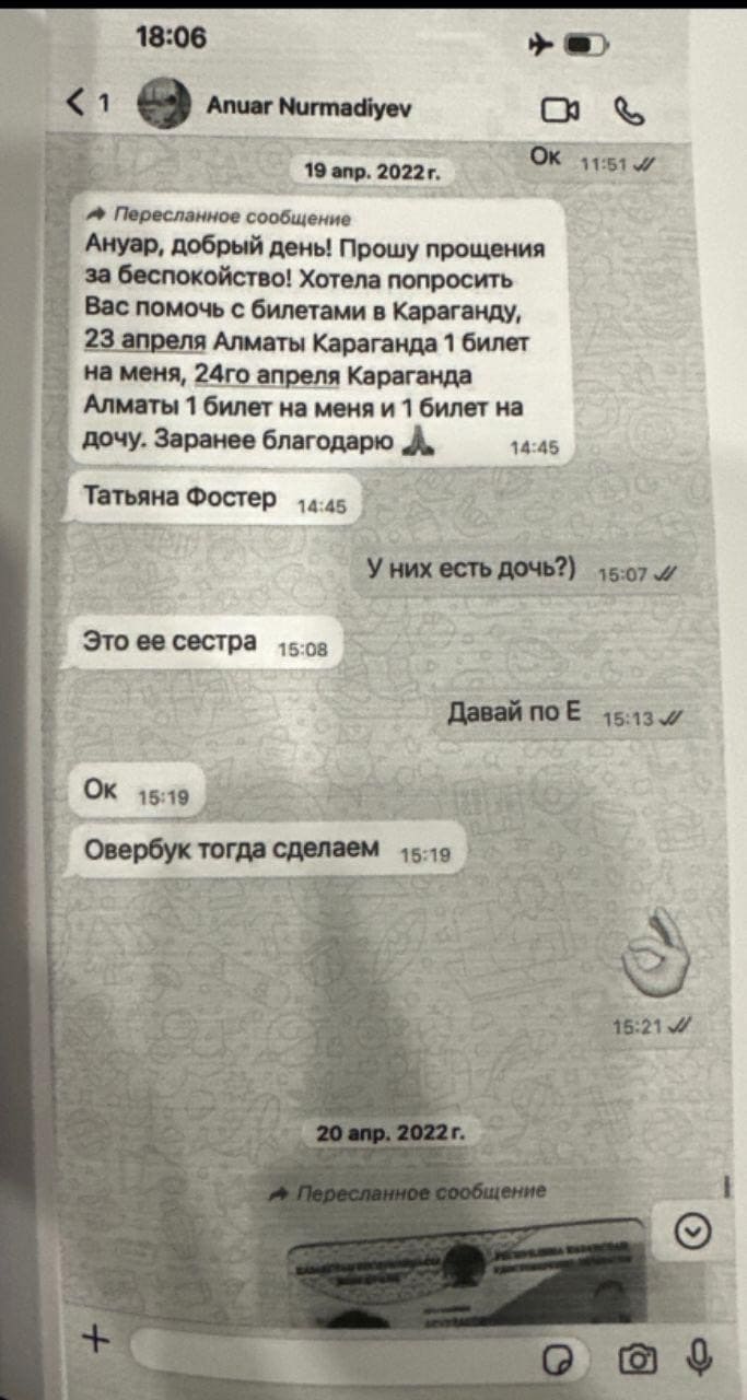 В качестве доказательств его защита опубликовала скрины переписок, где якобы фигурирует Татьяна Фостер, супруга экс-главы Air Astana Питера Фостера.