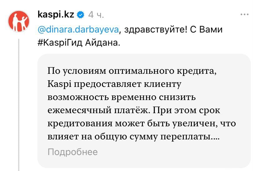 Представители Kaspi.kz прокомментировали ситуацию в соцсетях, подчеркнув, что данный продукт – это возможность временно снизить нагрузку на семейный бюджет. В банке настаивают: все условия, включая итоговую переплату и новый срок, озвучиваются клиенту до подписания документов.