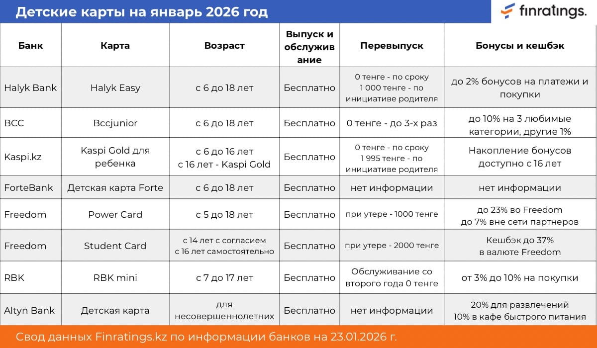 Обзор детских банковских карт Казахстана на январь 2026 год: возраст открытия, стоимость обслуживания, кешбэк, бонусы за оценки и возможности родительского контроля.