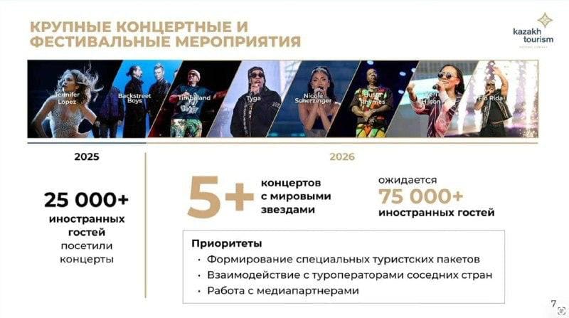 Казахстан в этом году делает ставку на музыкальный туризм. 27 января 2026 года глава Kazakh Tourism Талгат Газизов анонсировал приезд целой плеяды мировых артистов, передает Finratings.kz.