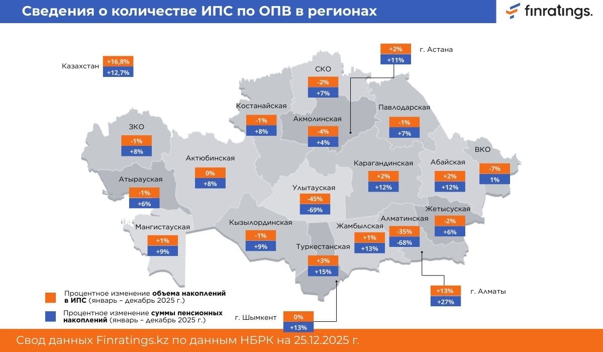 По обязательным пенсионным взносам (ОПВ) — основной части системы — рост был чуть скромнее, но все равно солидный: с примерно 21,24 трлн тенге на 1 декабря 2024 до 24,39 трлн тенге на 1 декабря 2025 (+14,9%).