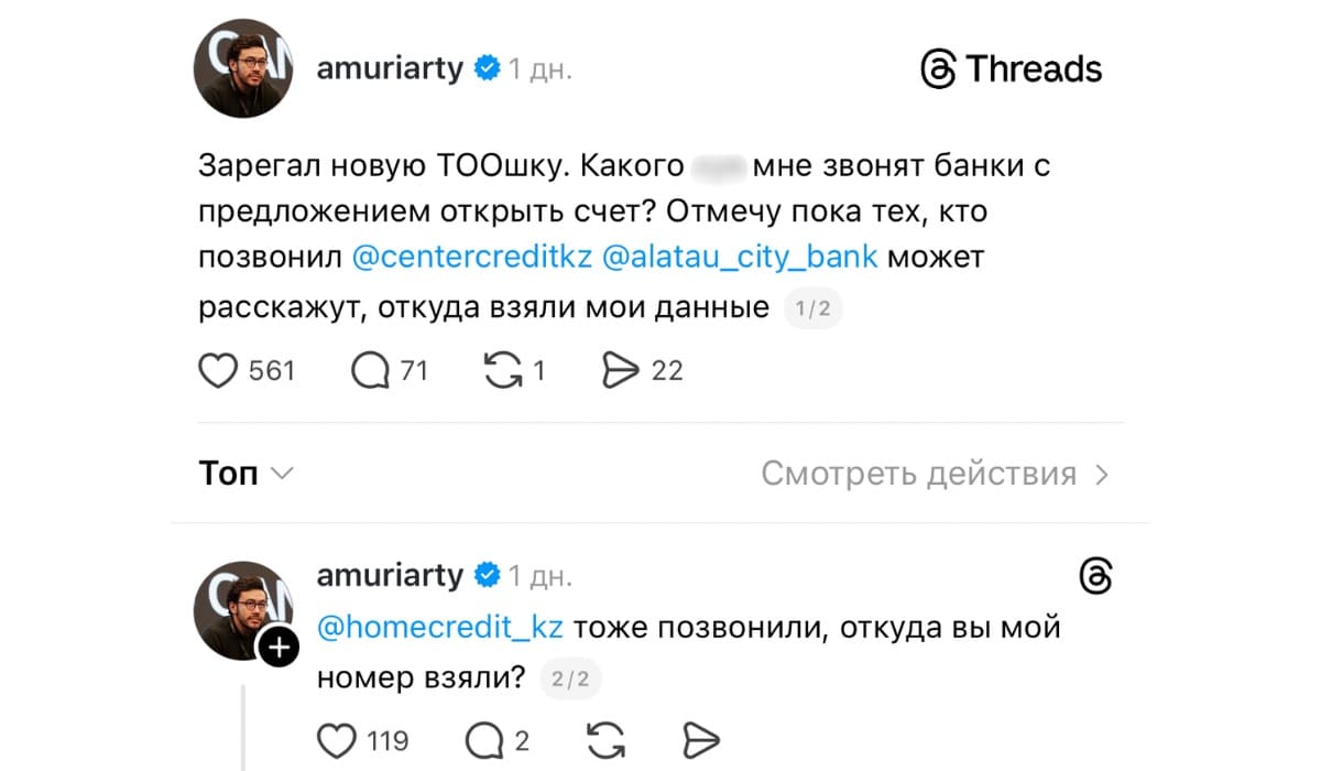 В соцсети Threads обсуждают ситуацию, которая знакома многим казахстанским предпринимателям. Основатель сервиса 1Fit под ником @amuriarty рассказал, что сразу после регистрации ТОО ему начали звонить банки с предложениями открыть расчетный счет — хотя свои контакты он им не оставлял.