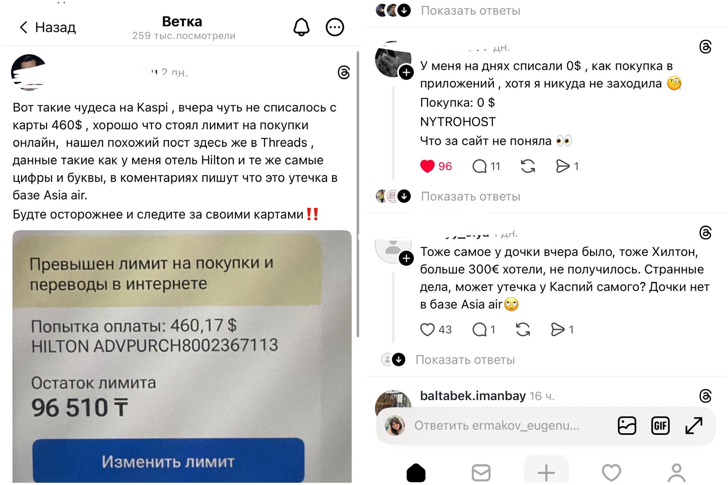 В комментариях казахстанцы высказывают версии — от масштабной утечки данных до возможных уязвимостей на стороне отдельных платформ или финансовых организаций. Часть пользователей связывает инциденты с регистрацией на популярных маркетплейсах, в том числе зарубежных.