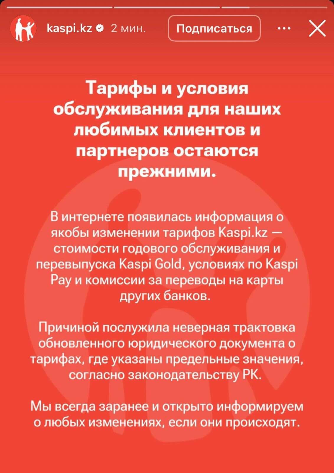 Позже в Kaspi.kz прокомментировали появившуюся в интернете информацию о якобы повышении тарифов по популярным продуктам. В компании заявили, что условия обслуживания для клиентов и партнеров не менялись.
