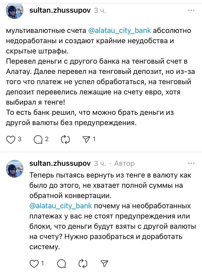 В соцсети Threads клиент Alatau City Bank рассказал, как неожиданно потерял деньги из-за автоматической конвертации внутри приложения, передает Finratings.kz.
