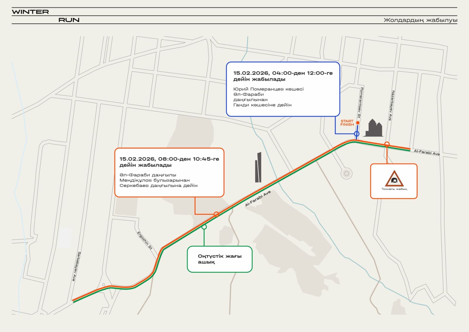В это воскресенье, 15 февраля 2026 года, в Алматы пройдет городской забег Winter Run-2026. Из-за мероприятия на несколько часов перекроют часть улиц в районе проспекта аль-Фараби, передает Finratings.kz.