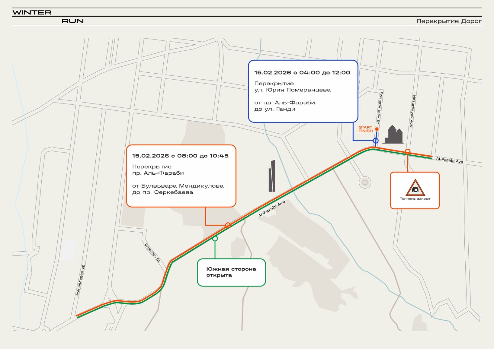 Из-за забега Winter Run временно ограничат автомобильное движение по части проспекта аль-Фараби и соседним улицам. Публикуем точное время и маршруты объезда.