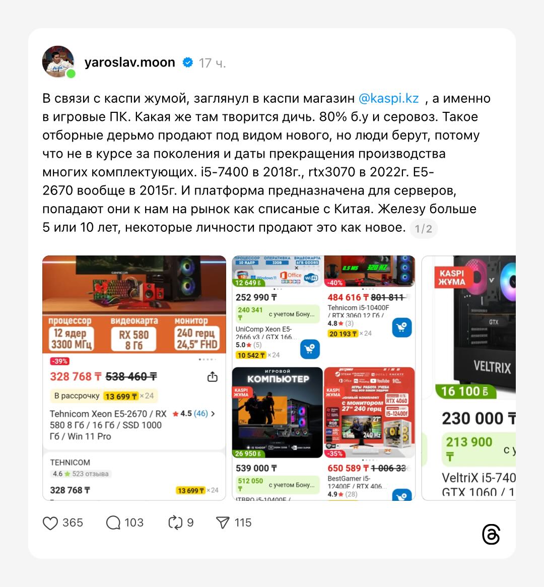 «В связи с каспи жумой, заглянул в каспи магазин... 80% б.у и серовоз. Такое отборное ****** продают под видом нового, но люди берут, потому что не в курсе за поколения и даты прекращения производства многих комплектующих. Железу больше 5 или 10 лет, некоторые личности продают это как новое».