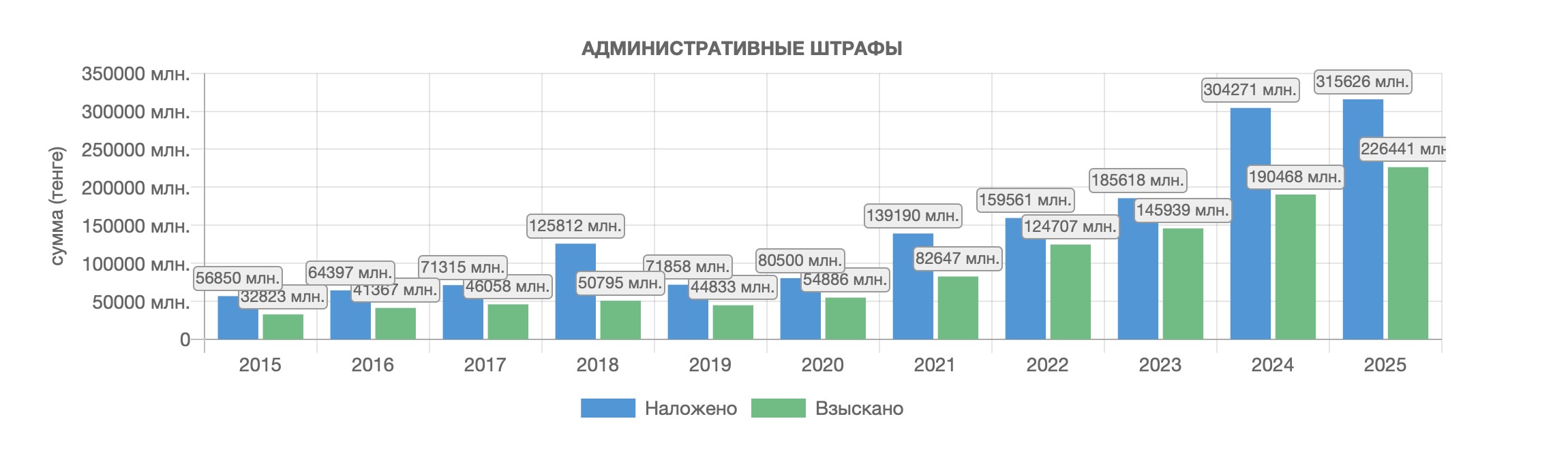 - Наложено штрафов: 315,6 млрд тенге (рост на 3,7%).