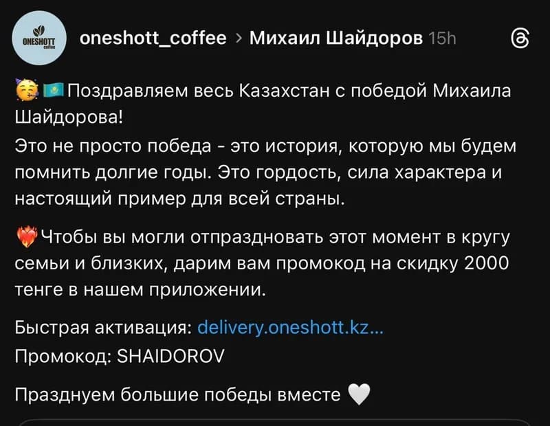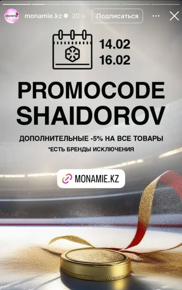 Победа Михаила Шайдорова на Олимпиаде-2026 неожиданно стала не только спортивным, но и маркетинговым событием. С 14 февраля 2026 года по Казахстану начала распространяться новая акция – промокод «Шайдоров», который массово подхватили бренды и сервисы, передает Finratings.kz со ссылкой на Zakon.kz.