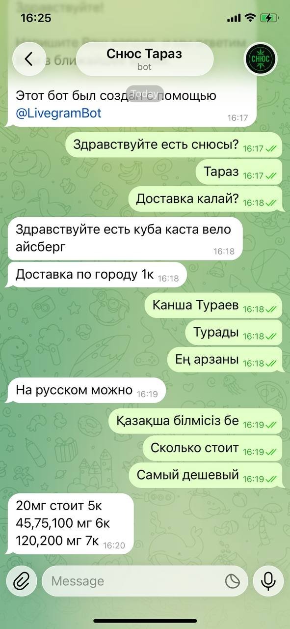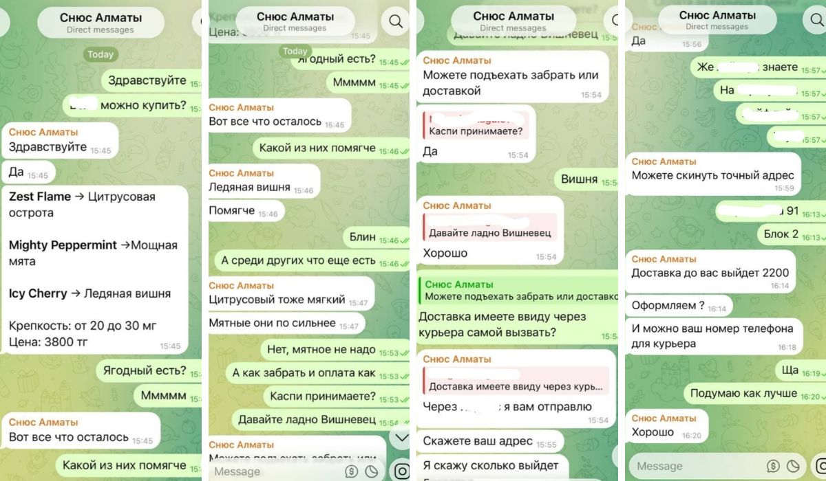 Ни один из них не поинтересовался возрастом покупателя. Ни один не напомнил об ответственности или запрете. Общение как на обычном рынке: есть товар – есть цена, хочешь бери – не хочешь проходи мимо. География торговли тоже впечатляет: Астана, Алматы, Шымкент, Тараз, Павлодар, Костанай, Кокшетау и другие города. Блокировки не становятся препятствием. Если один бот исчезает, то вскоре появляется другой. Если контакт удален, его заменяет новый. Получается, запрет убрал продукт из витрины, но теневой рынок работает.