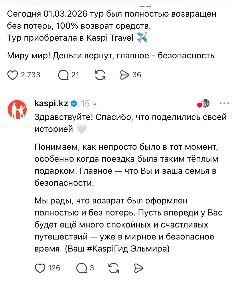 Айлин уточнила, что приобретала поездку через Kaspi Travel.