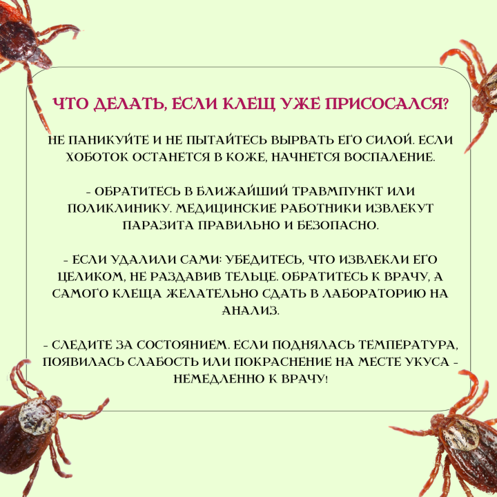 Врачи предупреждают: даже один укус – это уже риск. Особенно опасно, если клещ был на теле длительное время.