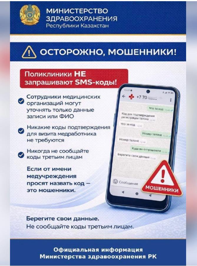 Мининистерство здравоохранения РК призвало не сообщать таким собеседникам SMS-коды, личные данные и не переходить по сомнительным ссылкам.