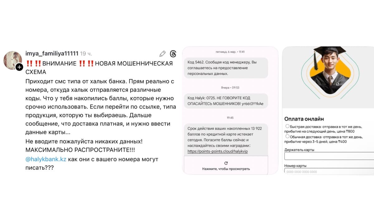 В соцсетях распространяется предупреждение о новой мошеннической схеме, замаскированной под рассылку от Halyk Bank. Пользователь Threads @imya_familiya11111 сообщил, что получил SMS якобы от банка — с того же номера, с которого обычно приходят коды подтверждения.
