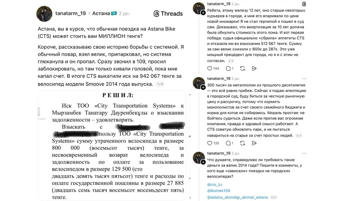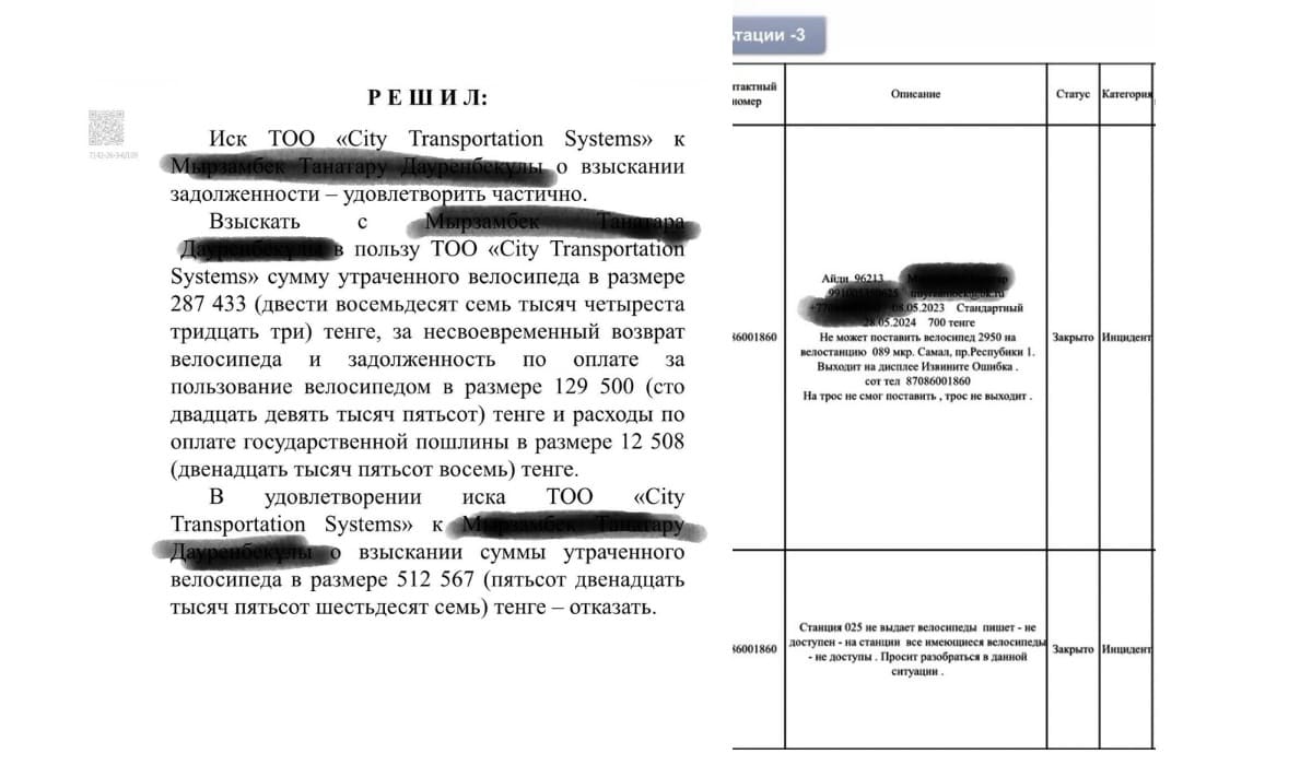 Конфликт начался после технического сбоя на велостанции во время возврата транспорта. Система не зафиксировала завершение поездки и заблокировала замок с ошибкой. Из-за этой неисправности велосипед модели Smoove 2014 года выпуска пропал. Оператор выставил пользователю счет на общую сумму 942 067 тенге.