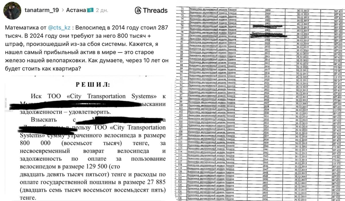 На предоставленных документах из бухгалтерского учета видно, что в 2015 году балансовая стоимость велосипедов модели Smoove составляла около 287 433 тенге за единицу. Спустя десять лет эксплуатации оператор системы проката потребовал в суде компенсацию в размере 800 000 тенге за один утерянный велосипед.