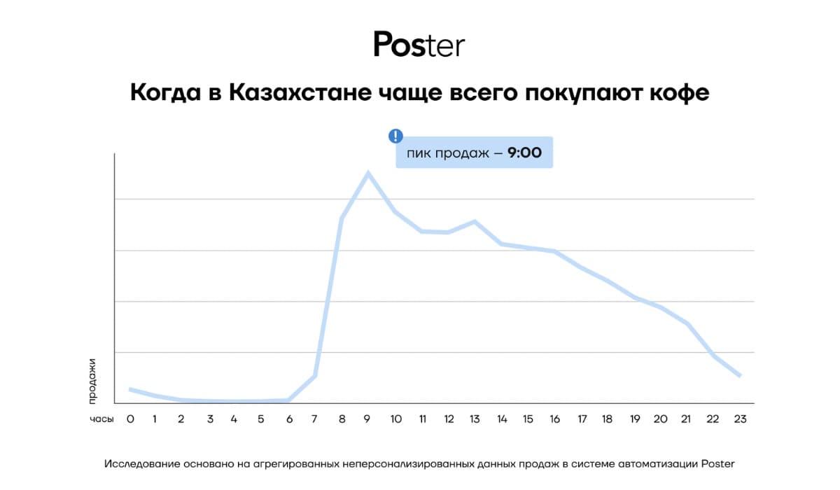 Пик продаж приходится на 9:00 утра. Более 26% заказов совершается в период с 8:00 до 10:00, а 50% чеков закрываются на 13:00. Это подтверждает, что кофе в Казахстане остается частью утренней рутины и рабочего дня.