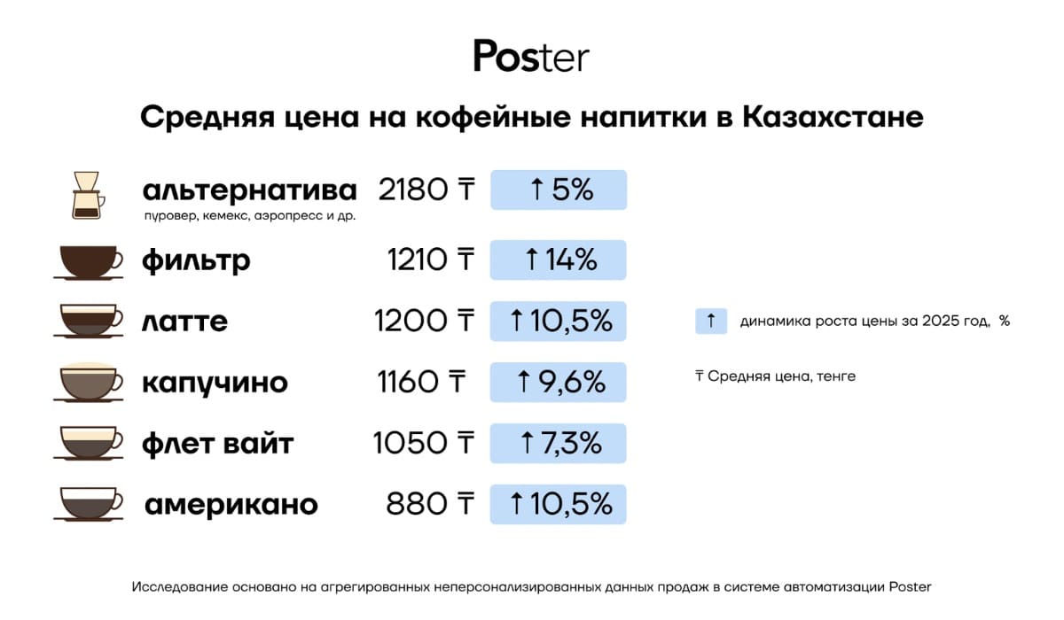 Согласно исследованию облачной системы автоматизации Poster, кофейная культура в Казахстане переживает период активного роста. В 2025 году количество проданных чашек кофе в заведениях страны увеличилось на 24% по сравнению с предыдущим годом. При этом средний чек за напиток вырос на 8%, достигнув отметки в 1310 тенге.