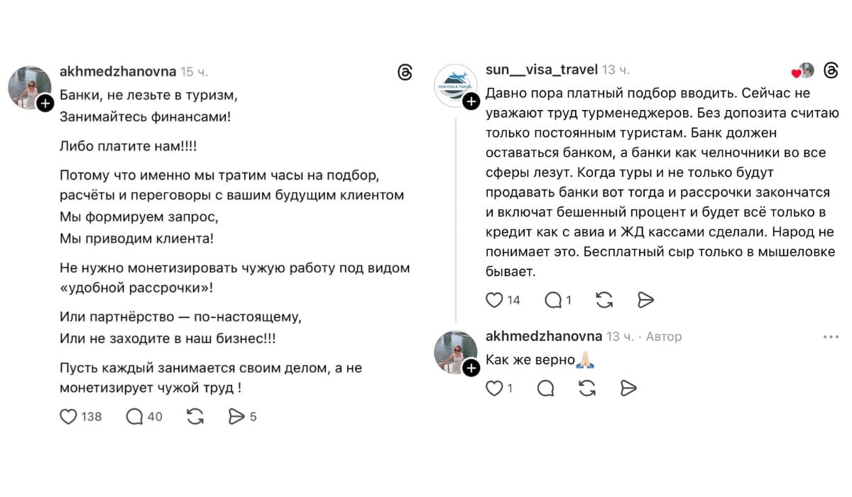 Главная претензия участников рынка заключается в том, что клиенты используют менеджеров для бесплатного подбора отелей и формирования туров, после чего совершают покупку через банковские приложения. По словам основателя Bueno Travel Гульнары Каримовой, банки получают готового клиента, не затрачивая ресурсов на его консультирование.