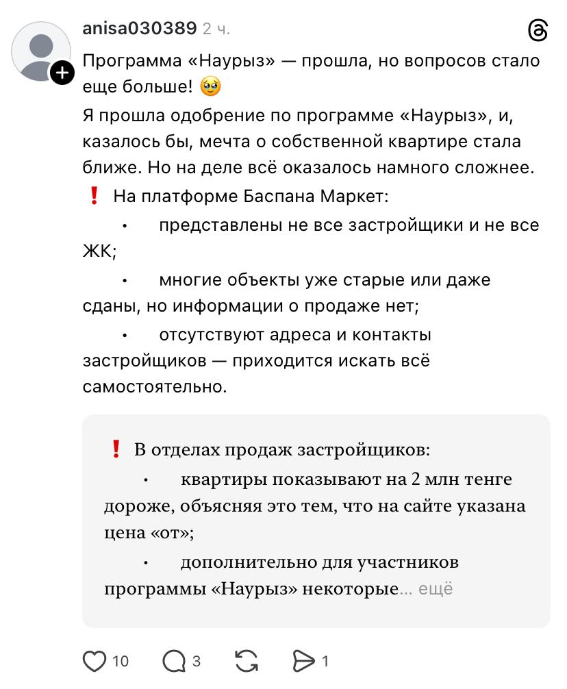 “На платформе Baspana Market оказалось мало вариантов: не все застройщики представлены, часть объектов уже устарела, а контактов и адресов часто нет – информацию приходится искать самостоятельно”, – написала она в Threads.