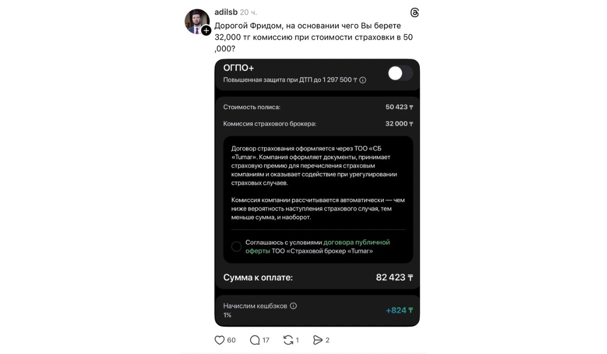 Один из примеров подобного появился в Threads, где пользователь обратил внимание на разницу между базовой стоимостью страховки и итоговой суммой с учетом комиссии. В его случае при цене полиса около 50 000 тенге комиссия составила порядка 32 000 тенге, что и вызвало вопросы.
