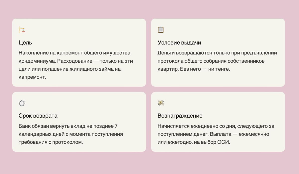 Продукт решает законодательно закреплённую задачу — отделить деньги на капремонт от операционных средств ОСИ. В этом смысле условный вклад ForteBank выполняет свою функцию.