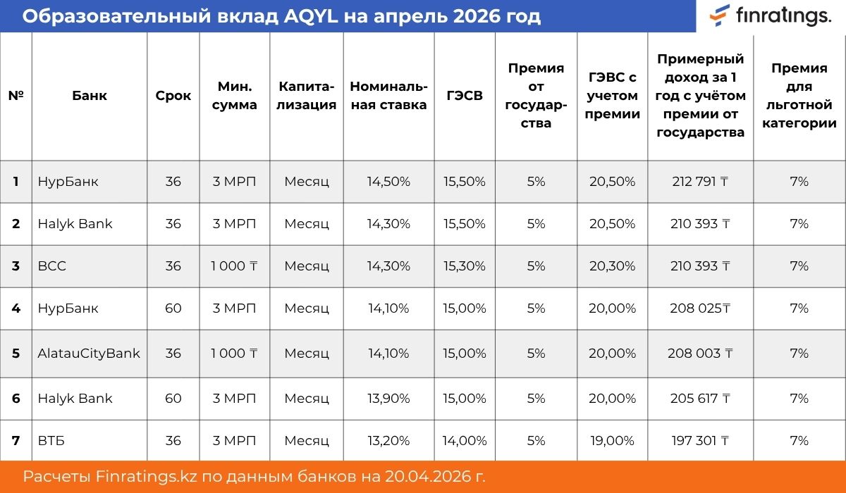 Вклад AQYL в апреле 2026: сколько можно заработать с 1 млн тенге за год