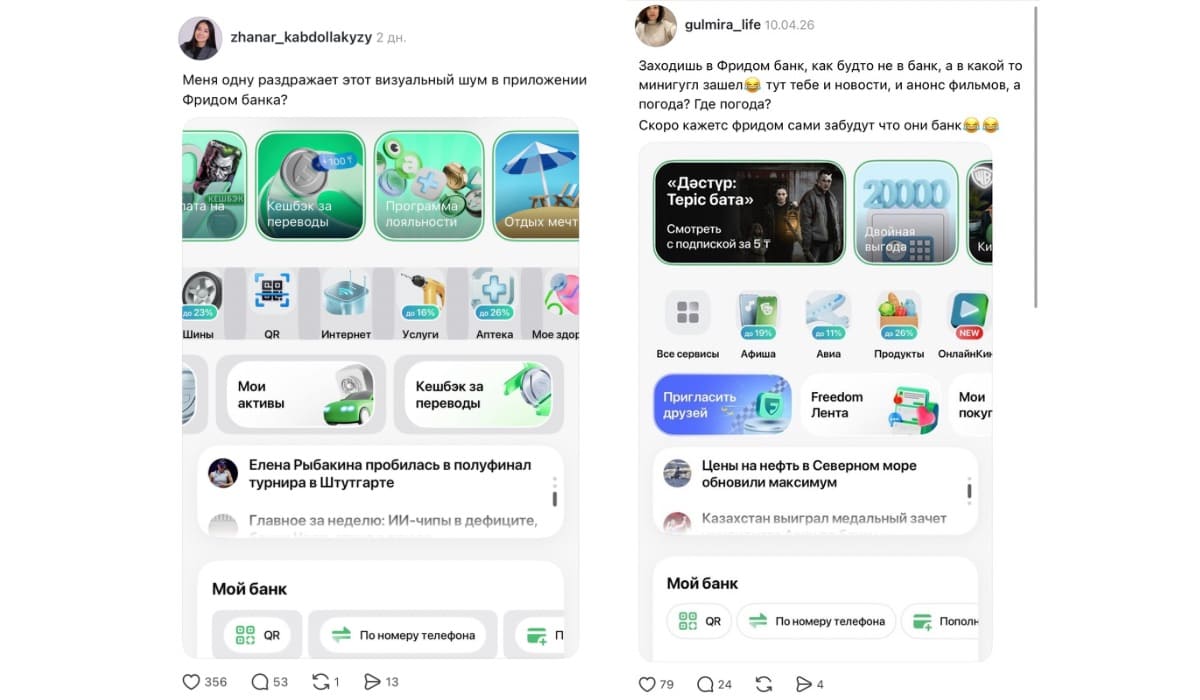 Обсуждение интерфейса приложения активно идет на платформе Threads. Пользователь @zhanar_kabdollakyzy задается вопросом, одну ли ее раздражает этот визуальный шум в приложении Freedom Bank. Ее мнение поддержали и другие клиенты, которые столкнулись с обилием небанковских функций.