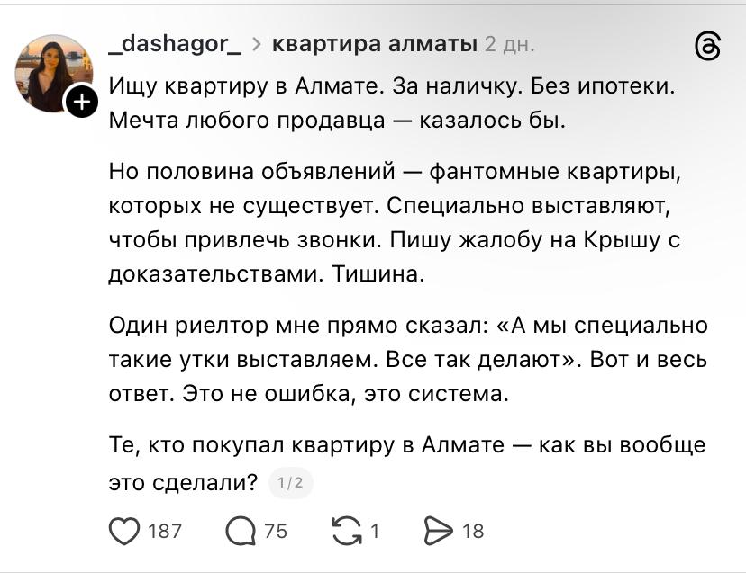 На этом фоне растет и раздражение из-за цен. По словам пользователей, обычная трехкомнатная квартира в Алматы уже стоит 70–100 млн тенге, а платежи по ипотеке доходят до 400–700 тысяч в месяц.