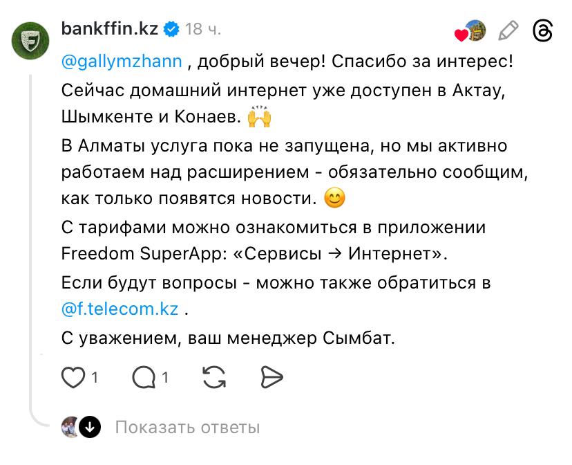 Поводом для ответа стал комментарий пользовательницы в Threads. Она публично обратилась к банку с вопросом, когда Freedom запустит домашний интернет в Алматы, и пожаловалась на проблемы с Beeline Kazakhstan.