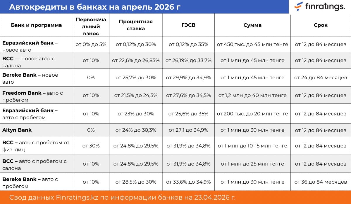 Второй сегмент — стандартные рыночные кредиты на новые и подержанные автомобили. В этой категории ставки значительно выше. Номинальный процент варьируется от 20% до 30%, а полная стоимость кредита может достигать 35% годовых. Некоторые банки готовы в кредит выдать до 50 миллионов тенге. При этом минимальный первоначальный взнос в большинстве организаций составляет 10%, хотя Altyn Bank и Bereke Bank заявляют о возможности оформления займа без стартового капитала.