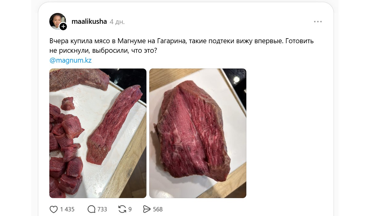 Алматинка рассказала, что купила мясо в Magnum на проспекте Гагарина, пишет Azattyq Rýhy.