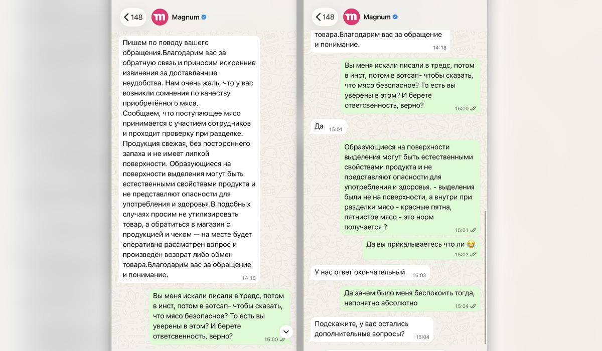 Позже, по словам покупательницы, с ней связались представители Magnum. Сеть запросила чек и номер телефона, а затем сообщила, что мясо проходит проверку при приемке и разделке.