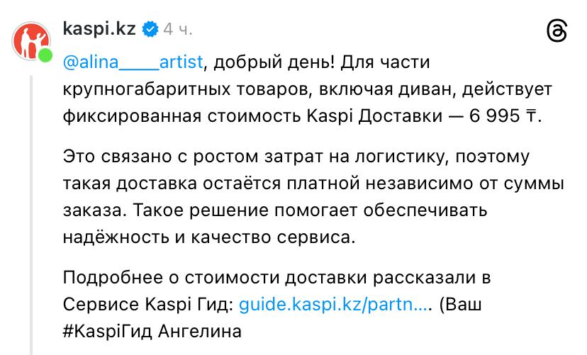 Одни пользователи поддержали Kaspi: диван нельзя доставить как обычную посылку, и бесплатной такая услуга быть не может.