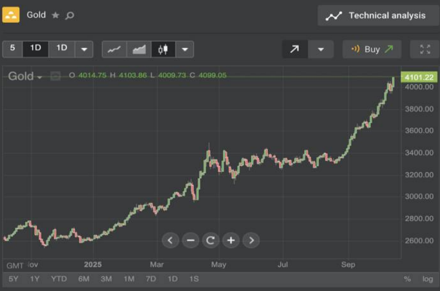В октябре 2025 года мировая цена золота обновила исторический максимум — впервые превысила 4100 долларов за тройскую унцию. Таким образом с начала года рост составил более 57%.