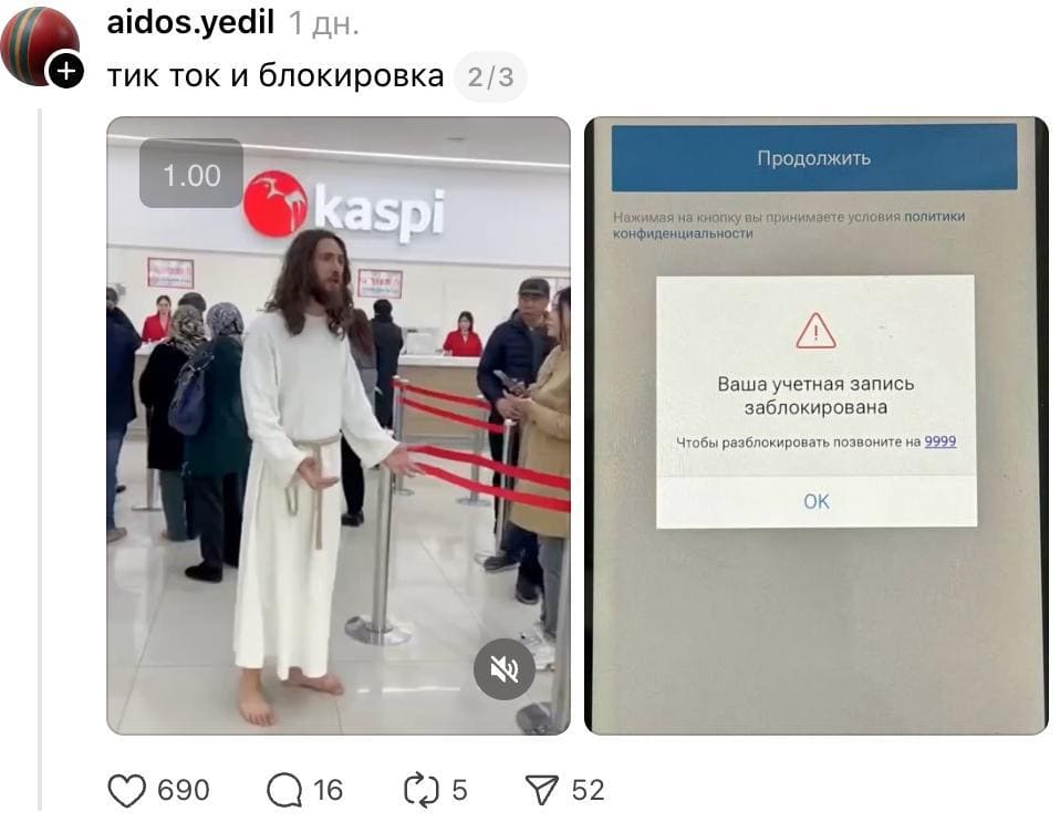 У одного из пользователей Kaspi.kz после публикации ролика в TikTok была временно заблокирована учетная запись в приложении, передает Finratings.kz со ссылкой на телеграм-канал “Бычий звоночек”.