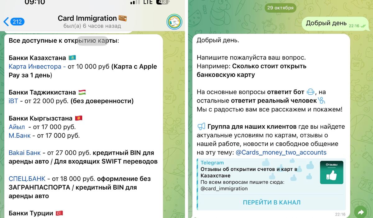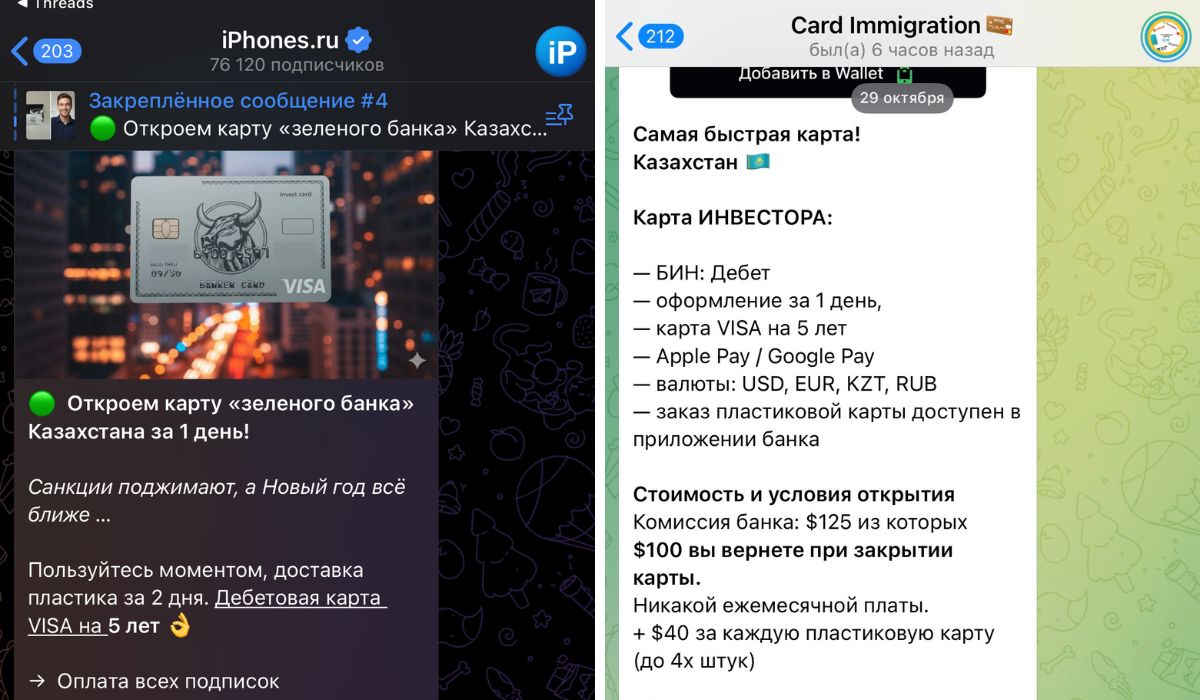 Россиянам продают карты Freedom Bank Казахстана через Telegram