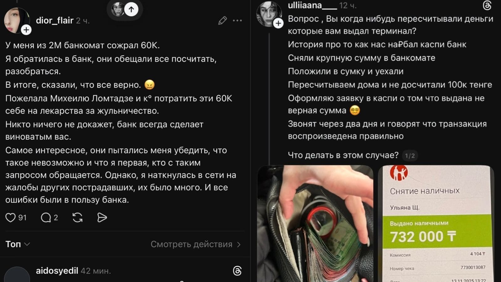 Девушка сняла 4 млн тенге и обнаружила недостачу дома. В Threads разгорается спор о банкоматах.
