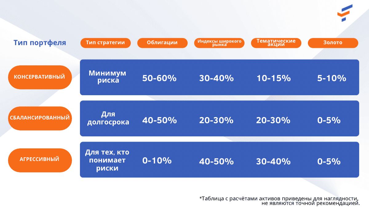 Финансовый эксперт Ренат Файзулин выделяет три базовых типа портфелей в зависимости от возраста, горизонта инвестирования и готовности к риску.
