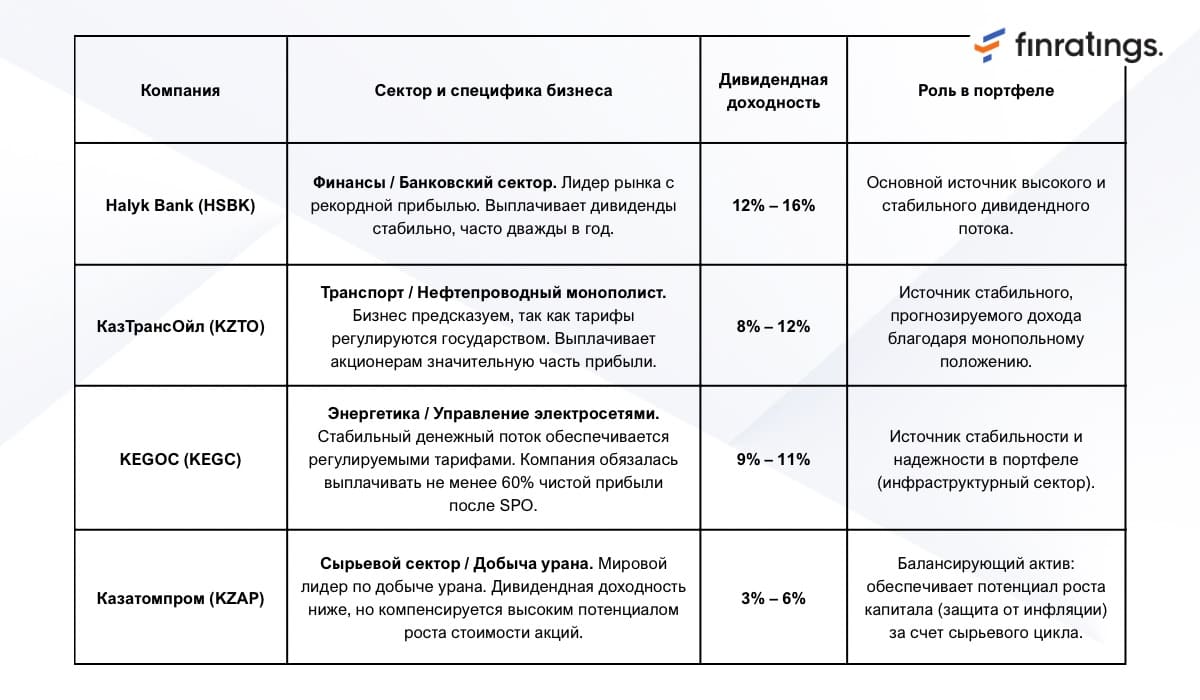 По словам портфельного менеджера рената Файзулина, 8 из 10 компаний Индекса KASE стабильно выплачивают дивиденды. Среди них Halyk Bank, KEGOC, КазМунайГаз, Kaspi.kz, Казатомпром, Казахтелеком и КазТрансОйл.